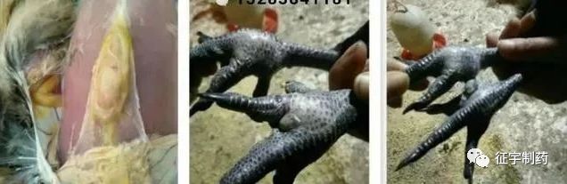 鸡喜卧、站不稳、体质消瘦、龙骨和关节处有黄色粘液的现象,趾关节和跗关节肿胀较严重手摸上去有滑动感,严重的鸡久卧不起非常消瘦。解剖未发现有其他病混合感染。
